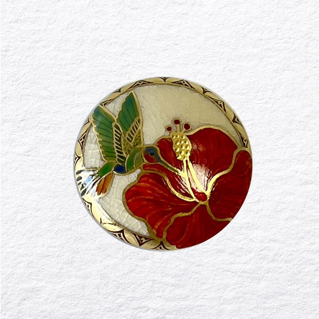 この二つをバランス良く配置し、釉裏金彩の技法を使い、絵の具の下にほんのり煌めくカラフルなハチドリを表現しております。
