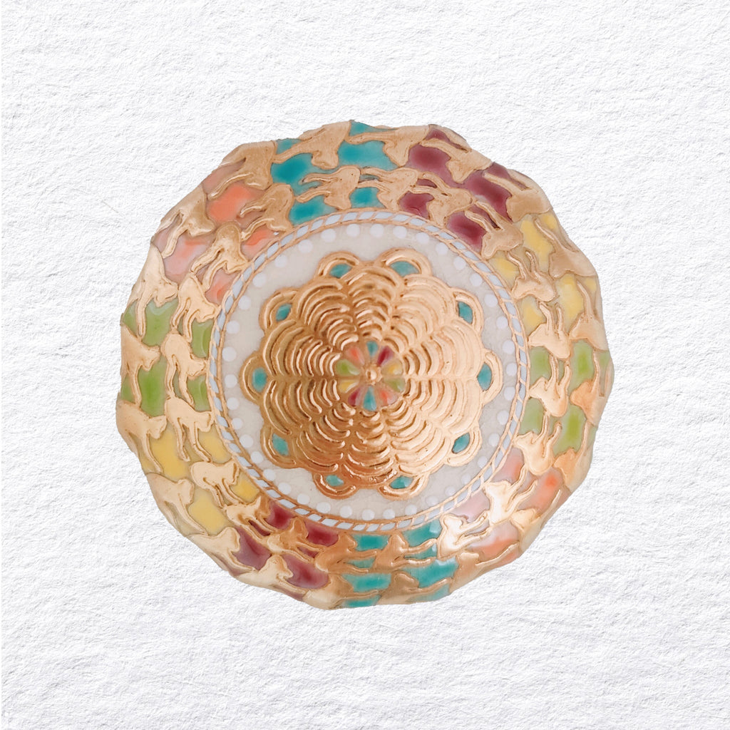 このボタンには、猿が円(えん)形に繋がり、お互いが毛づくろいをしているデザインにしました。猿は盛金できらびやかに表現し、色味はカラフルに仕上げました。